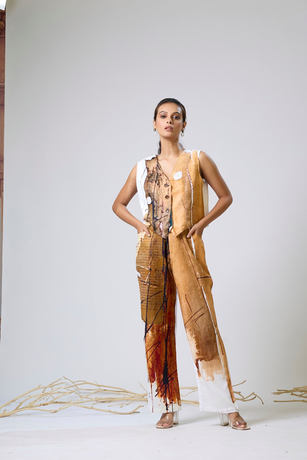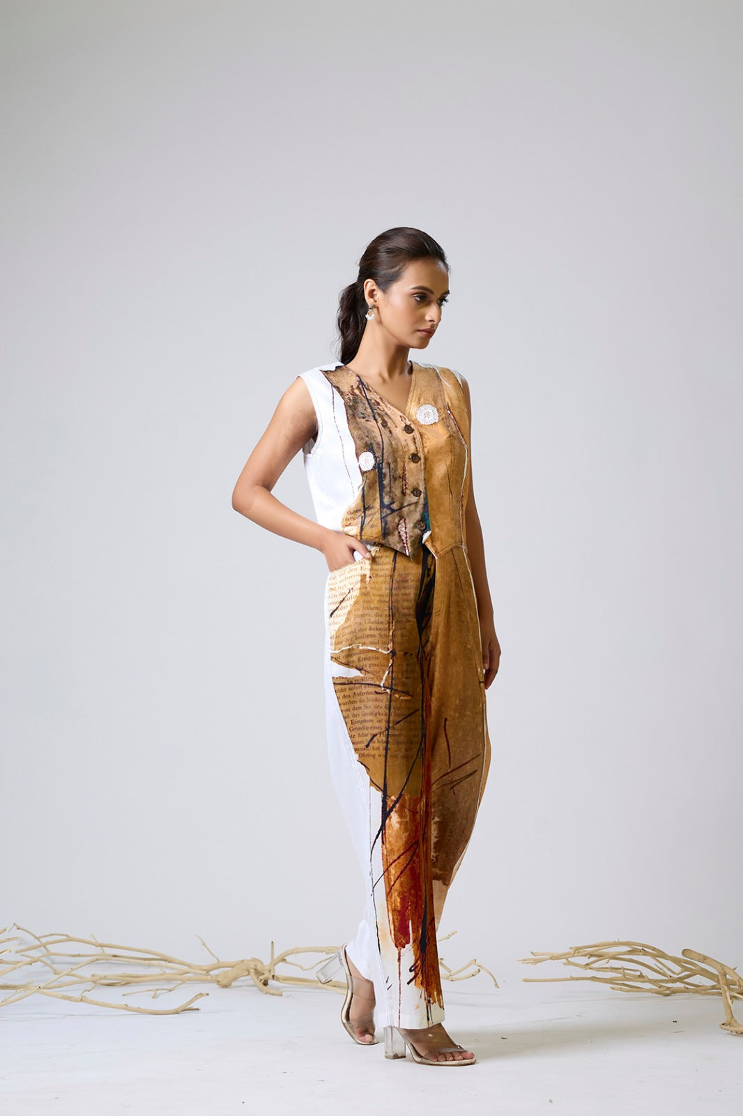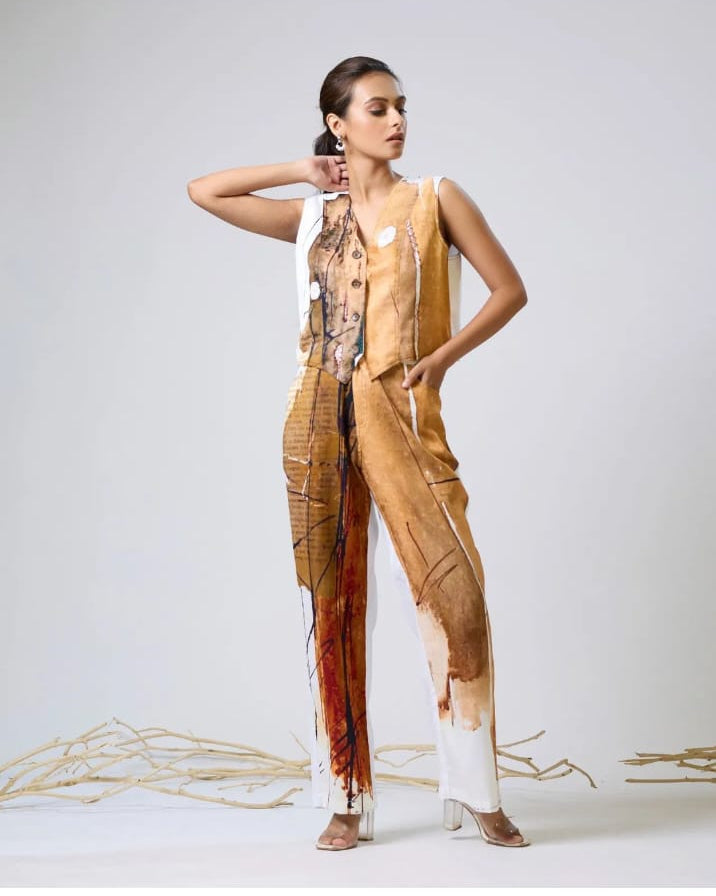Digital print waistcoat set with hand embroidery