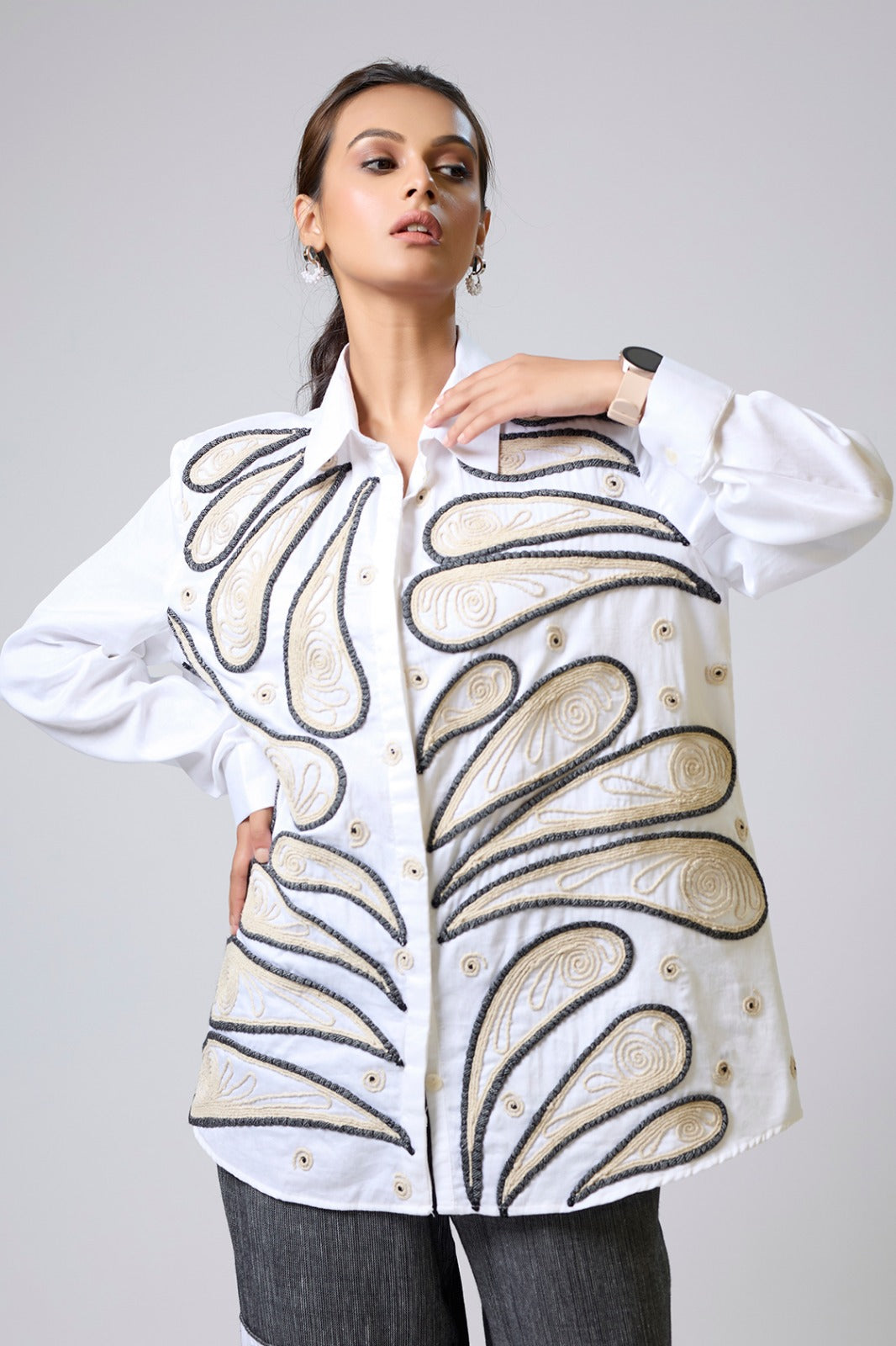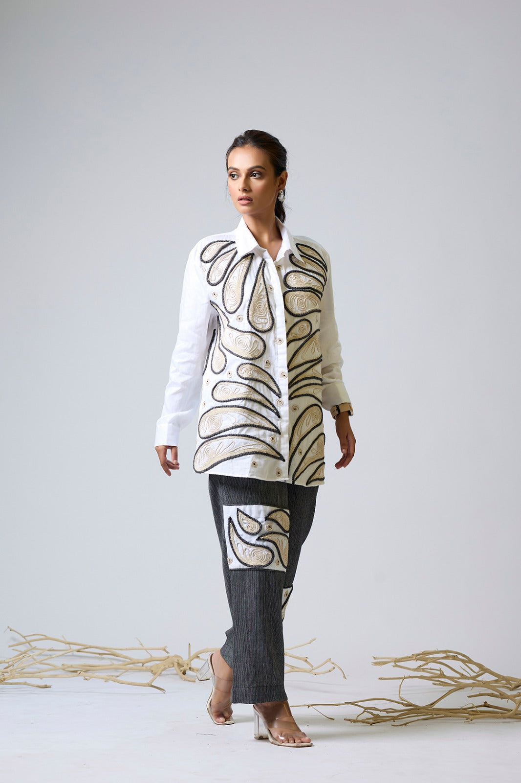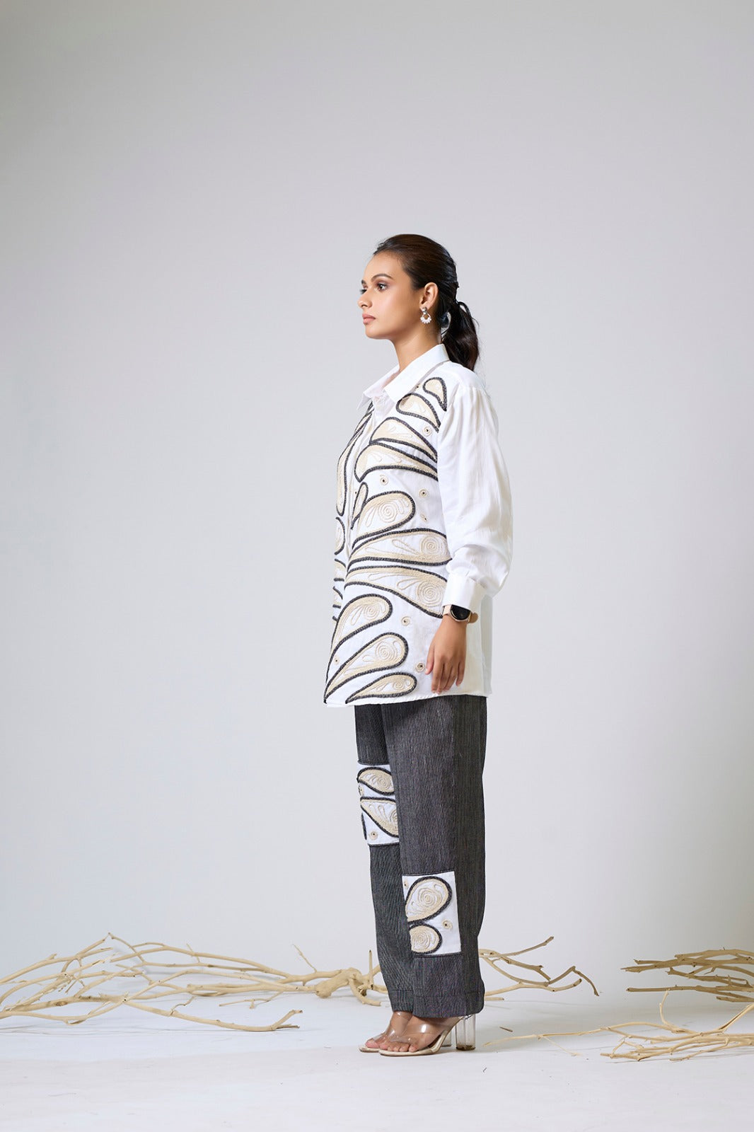 Cotton shirt with cord embroidery with denim pants and patch work details