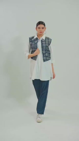 This ensemble is made by Denim Strips of different colors with Metal detailing. Can be bought separately or paired with a Denim Pants and Cotton White Shirt